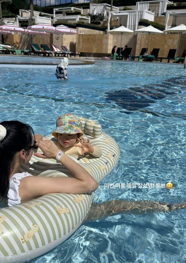 공개된 사진에는 손연재가 아들과 함께 수영장에서 시간을 보내는 모습이 담겼다. 튜브 위에 앉아 여유를 즐기는 아들과 그를 바라보고 있는 손연재의 뒷모습이 눈길을 끈다. 군살 하나 없는 손연재의 팔뚝이 특히 인상적이다.