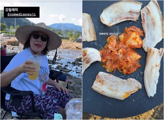 밀짚모자에 일바지, 선글라스를 쓴 편안한 차림의 이수지는 시원한 음료를 마시며 여름 더위를 식히고 있다. 여기에 그는 삼겹살에 김치를 구워먹는 동영상을 게재, "여배우의 저녁식단"이라는 글을 덧붙여 웃음을 더했다.