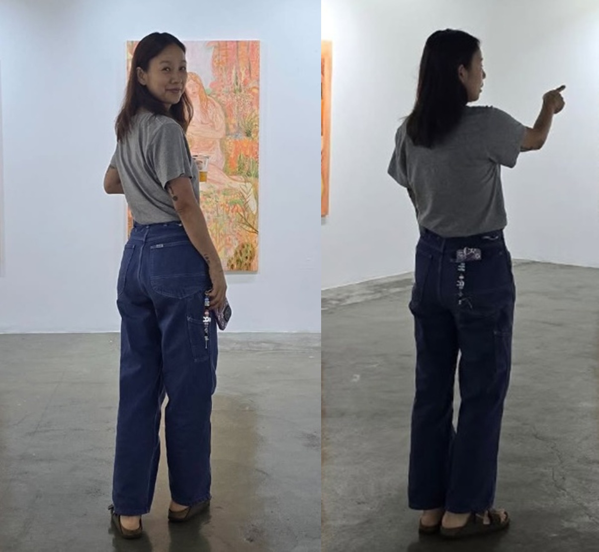 한 손에는 일회용 컵을 들고 작품을 감상하거나 미소 지으며 뒤돌아보는 자연스러운 모습이 담겼다. 뒷주머니에 꽂힌 핸드폰 스트랩과 샌들까지 수수하지만 자신만의 스타일을 드러냈다.