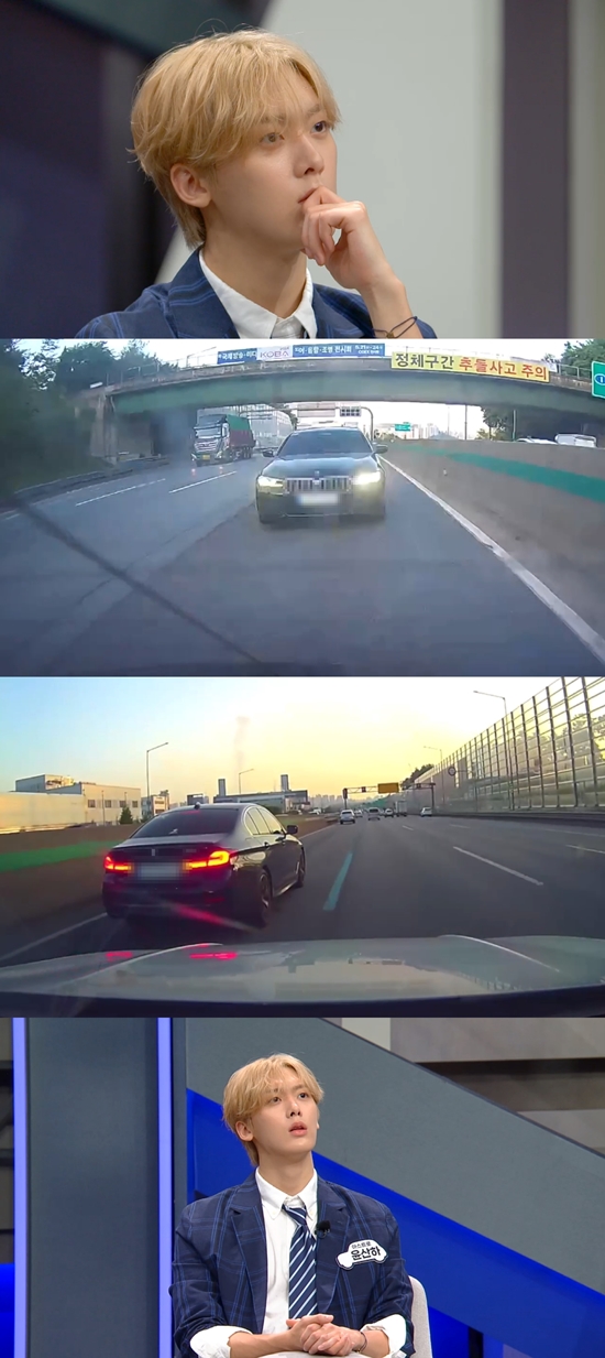 공개된 블랙박스 영상에는 고속도로 1차로를 주행하던 블박차 뒤로 빠르게 접근한 차량이 상향등을 반복적으로 깜빡이는 모습이 포착된다. 이를 인지한 블박차가 2차로로 비켜준 뒤 다시 1차로로 진입하자, 상대 차량은 갑자기 급브레이크를 밟으며 위협운전을 감행하고, 이를 본 패널들은 "와 진짜 미쳤다"라며 입을 다물지 못한다.