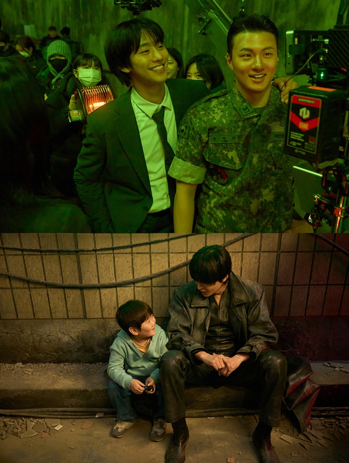 김독자 역의 안효섭과 이현성 역의 신승호는 카메라 앞에서 자연스럽게 어깨동무를 하며 즐겁게 촬영에 임하고 있다. 캐릭터 속 냉철함과 강인함은 잠시 내려놓은 채, 카메라 너머로 환하게 웃고 있는 두 사람의 모습은 끈끈한 팀워크를 엿보게 한다. 소설 속 주인공 유중혁 역의 이민호는 영화 속 카리스마 넘치는 캐릭터와는 달리 카메라 밖에서는 사랑스러운 눈빛으로 이길영 역의 권은성을 바라보고 있다.