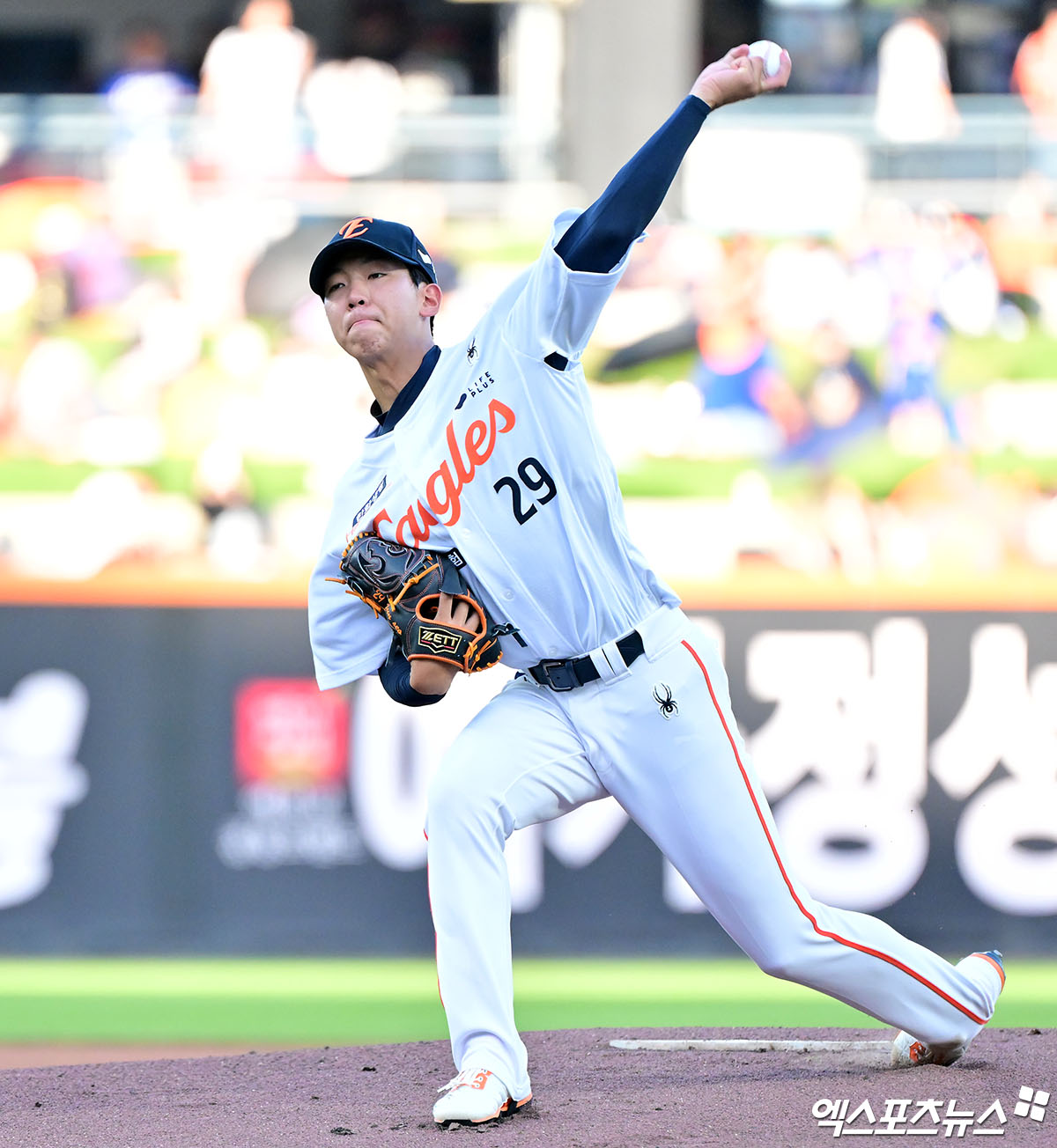 (엑스포츠뉴스 대전, 김한준 기자) 29일 오후 대전 한화생명 볼파크에서 열린 '2025 신한 SOL Bank KBO리그' 삼성 라이온즈와 한화 이글스의 경기, 1회초 한화 선발투수 황준서가 공을 힘차게 던지고 있다.