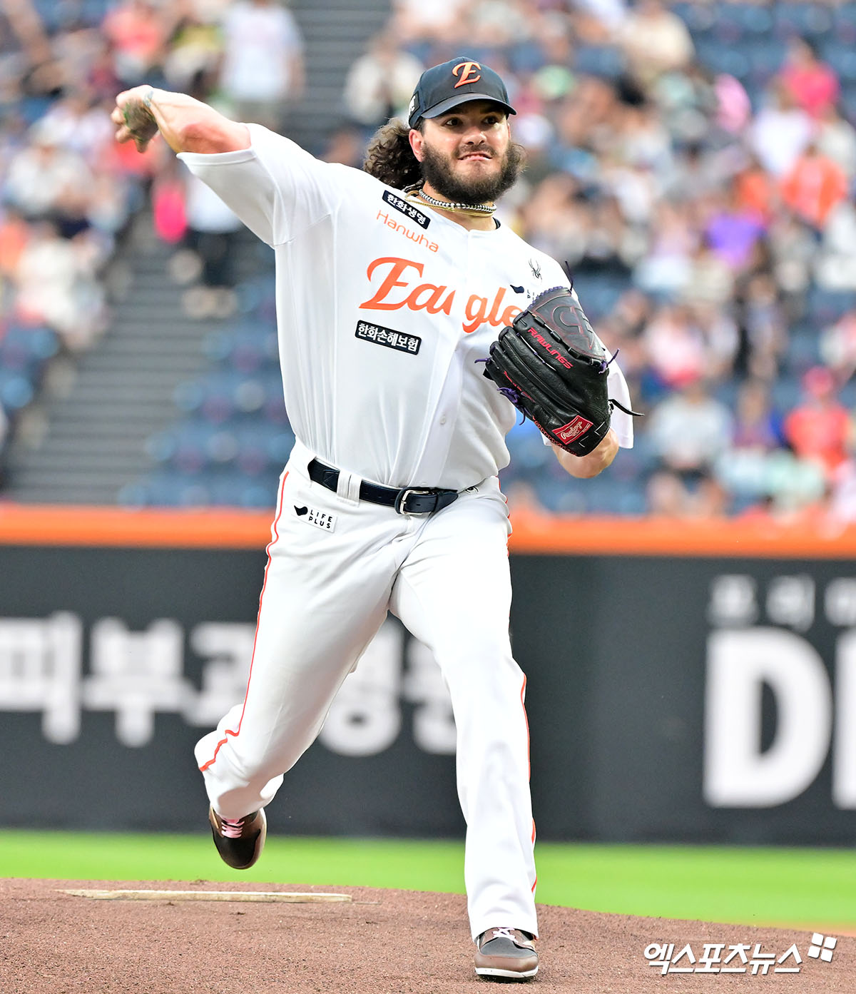 (엑스포츠뉴스 대전, 김한준 기자) 30일 오후 대전 한화생명 볼파크에서 열린 '2025 신한 SOL Bank KBO리그' 삼성 라이온즈와 한화 이글스의 경기, 1회초 한화 선발투수 폰세가 공을 힘차게 던지고 있다.