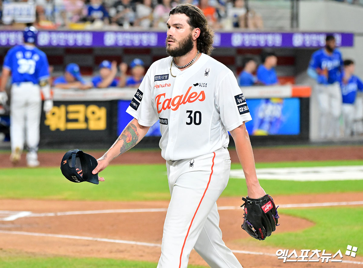 (엑스포츠뉴스 대전, 김한준 기자) 30일 오후 대전 한화생명 볼파크에서 열린 '2025 신한 SOL Bank KBO리그' 삼성 라이온즈와 한화 이글스의 경기, 6회초 수비를 마친 한화 폰세가 더그아웃으로 향하고 있다.