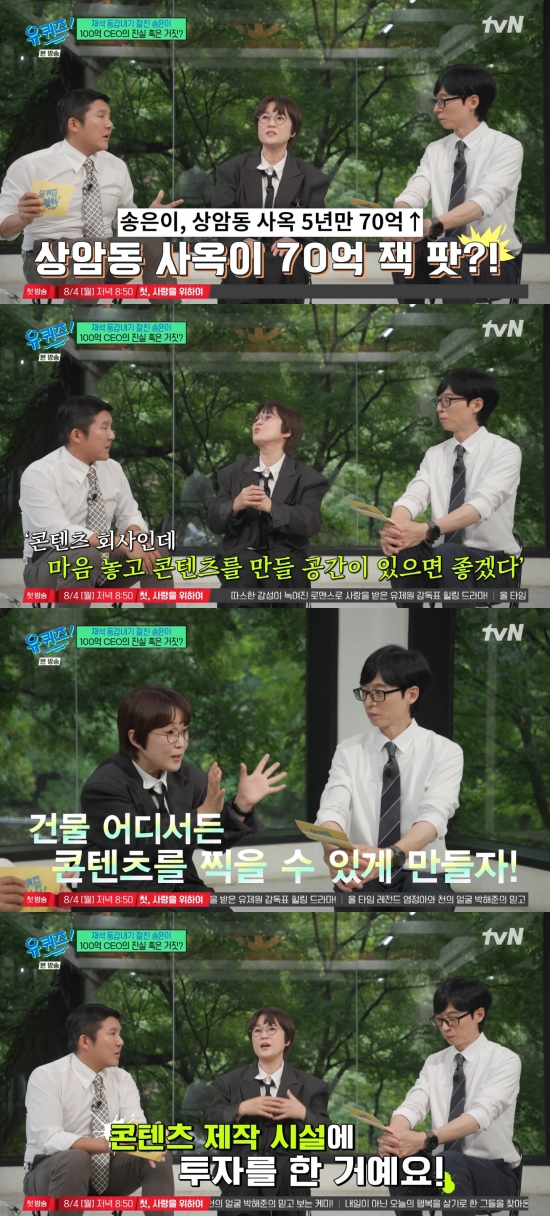 조세호는 "제보에 의하면 상암동 사옥이 70억 잭팟이 터졌다고"라며 궁금해했고, 송은이는 "부동산 투자로 그걸 한 게 아니라 콘텐츠 회사인데 마음 놓고 콘텐츠를 찍을 수 있는 공간이 있었으면 좋겠다. 저희 건물 전체를 어디다 갖다 대도 콘텐츠를 찍을 수 있게 만들자. 시설을 위해 거기에 투자했다고 보는 게 더 맞는 거 같다"라며 설명했다.