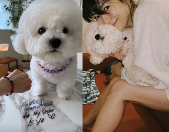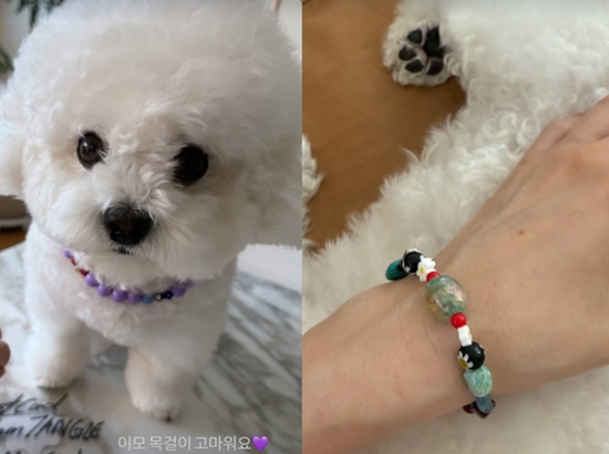사진 속 송혜교는 자신의 반려견 루비가 목걸이를 끼고 한껏 귀여움을 뽐내고 있는 모습을 자랑했다. 송혜교는 같은 디자인의 팔찌를 착용하고 반려견과의 커플템을 인증했다.