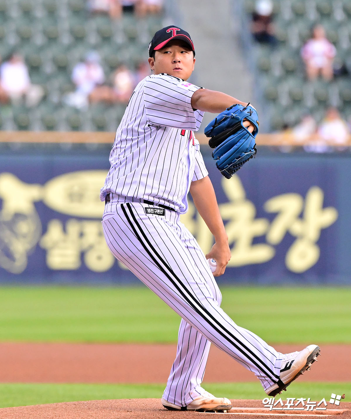 (엑스포츠뉴스 잠실, 김한준 기자) 31일 오후 서울 송파구 잠실야구장에서 열린 '2025 신한 SOL Bank KBO리그' KT 위즈와 LG 트윈스의 경기, 1회초 LG 선발투수 송승기가 공을 힘차게 던지고 있다.