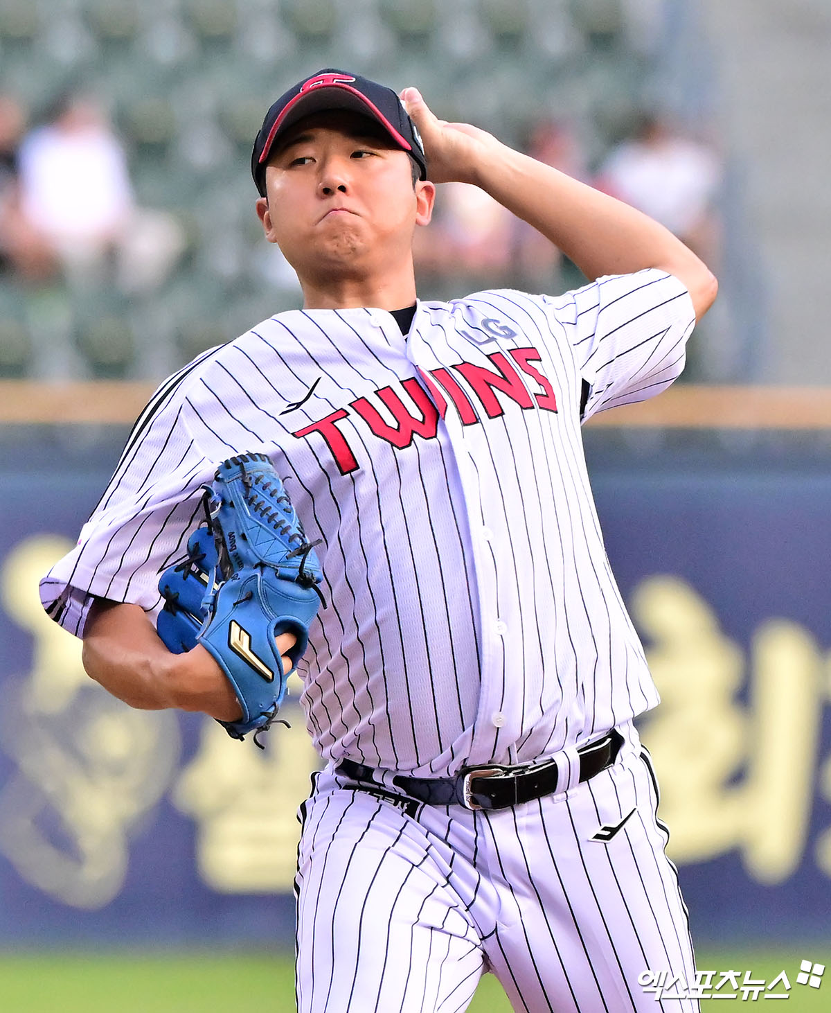 (엑스포츠뉴스 잠실, 김한준 기자) 31일 오후 서울 송파구 잠실야구장에서 열린 '2025 신한 SOL Bank KBO리그' KT 위즈와 LG 트윈스의 경기, 1회초 LG 선발투수 송승기가 공을 힘차게 던지고 있다.