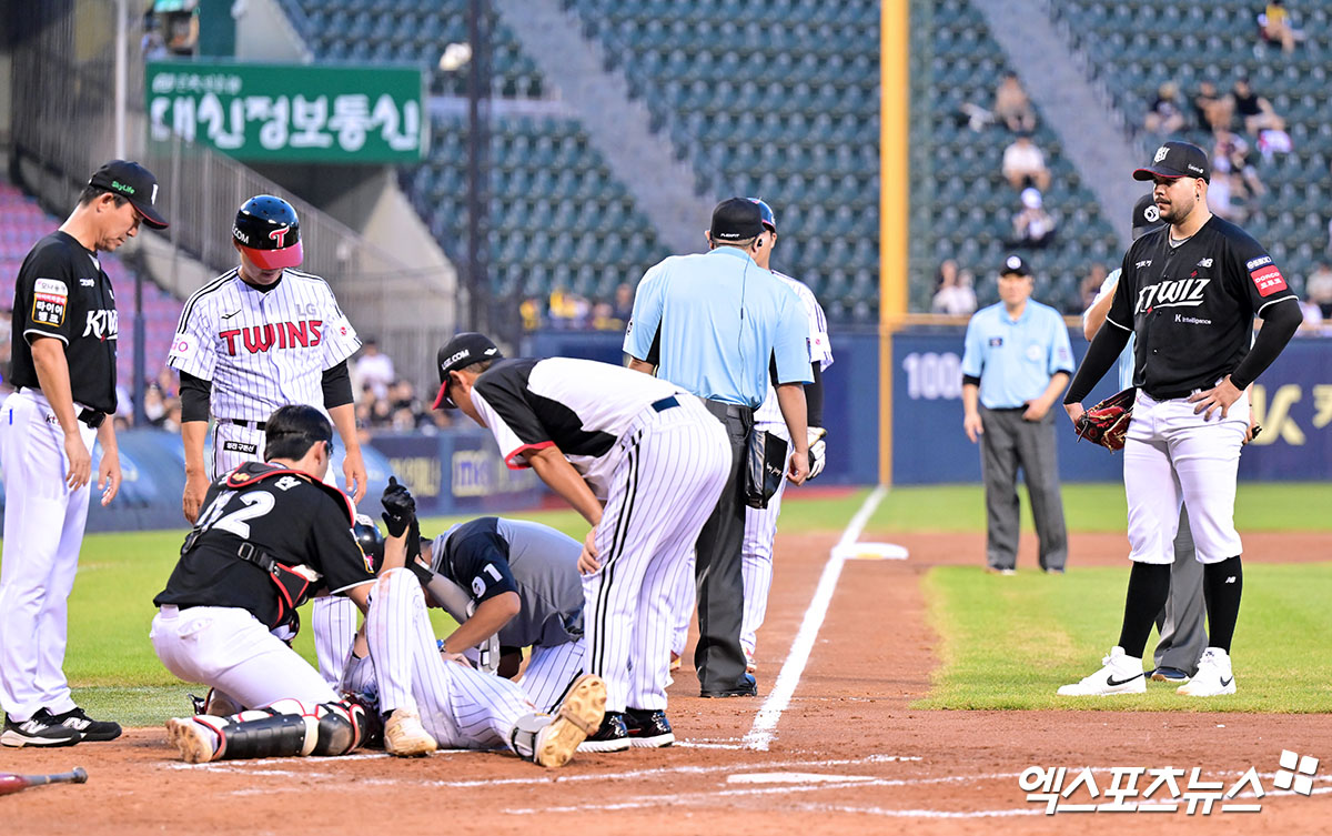 (엑스포츠뉴스 잠실, 김한준 기자) 31일 오후 서울 송파구 잠실야구장에서 열린 '2025 신한 SOL Bank KBO리그' KT 위즈와 LG 트윈스의 경기, 3회말 1사 1,3루 LG 손용준이 헤드샷을 맞고 있다.