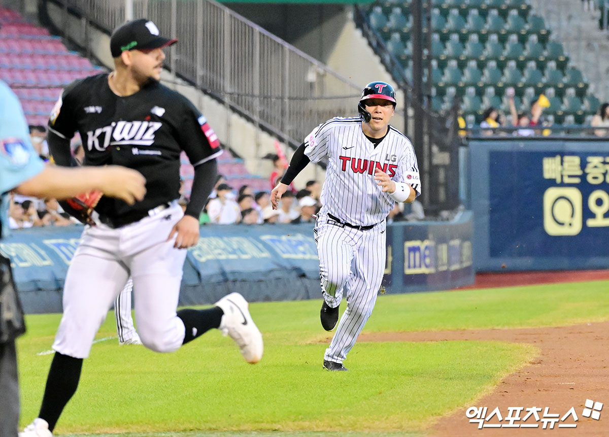 (엑스포츠뉴스 잠실, 김한준 기자) 31일 오후 서울 송파구 잠실야구장에서 열린 '2025 신한 SOL Bank KBO리그' KT 위즈와 LG 트윈스의 경기, 3회말 1사 2루 LG 김현수가 문보경의 1타점 적시타때 홈으로 쇄도하고 있다.