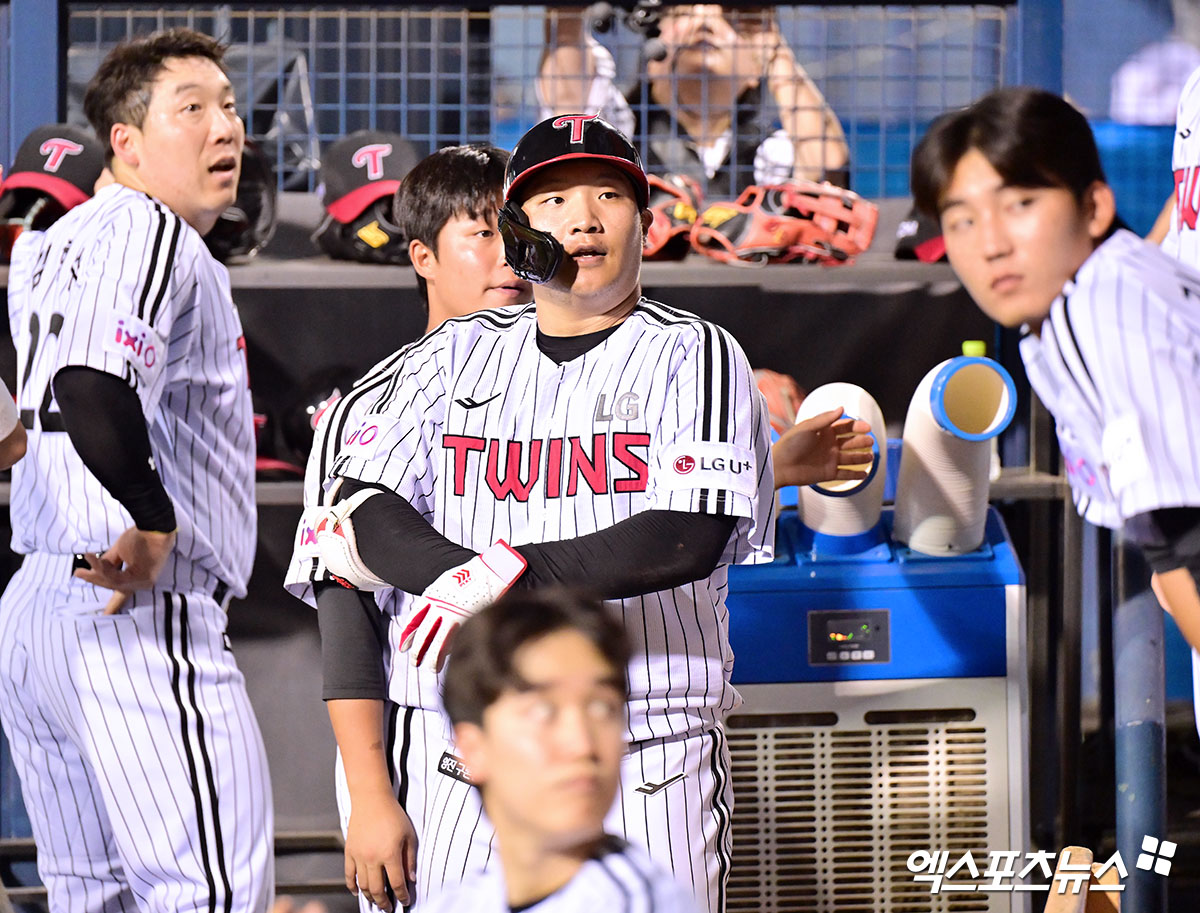 (엑스포츠뉴스 잠실, 김한준 기자) 31일 오후 서울 송파구 잠실야구장에서 열린 '2025 신한 SOL Bank KBO리그' KT 위즈와 LG 트윈스의 경기, 4회말 1사 1루 LG 문보경이 투런 홈런을 날린 후 기뻐하고 있다.