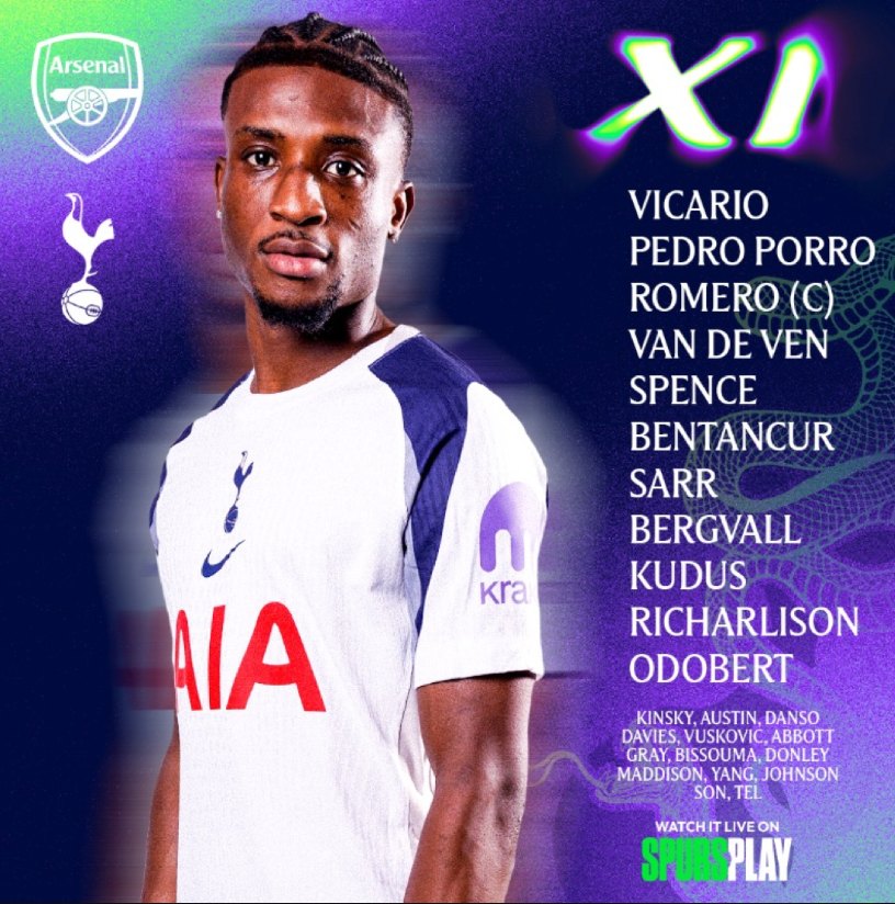 굴리엘모 비카리오가 골문을 지키고, 제드 스펜스, 미키 판더펜, 크리스티안 로메로, 페드로 포로가 백4를 구성한다. 3선은 파페 사르와 로드리고 벤탄쿠르가 지키고, 2선에 윌슨 오도베르, 루카스 베리발, 모하메드 쿠두스가 배치. 최전방 원톱 자리에 히샬리송이 이름을 올렸다.