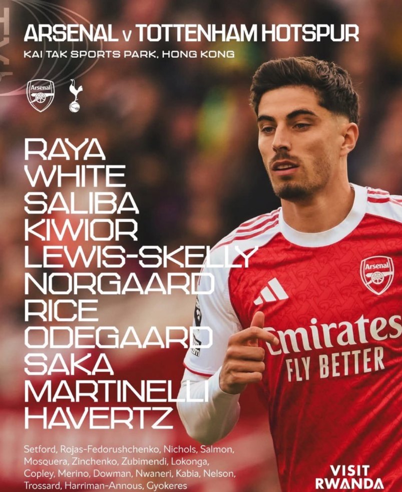 다비드 라야가 골키퍼 장갑을 끼고, 마일스 루이스스켈리, 야쿠프 키비오르, 윌리엄 살리바, 벤 화이트가 백4를 형성한다. 중원에서 데클란 라이스, 크리스티안 뇌르고르, 마르틴 외데고르가 호흡을 맞추고, 최전방에서 가브리엘 마르티넬리, 카이 하베르츠, 부카요 사카가 토트넘 골문을 노린다.