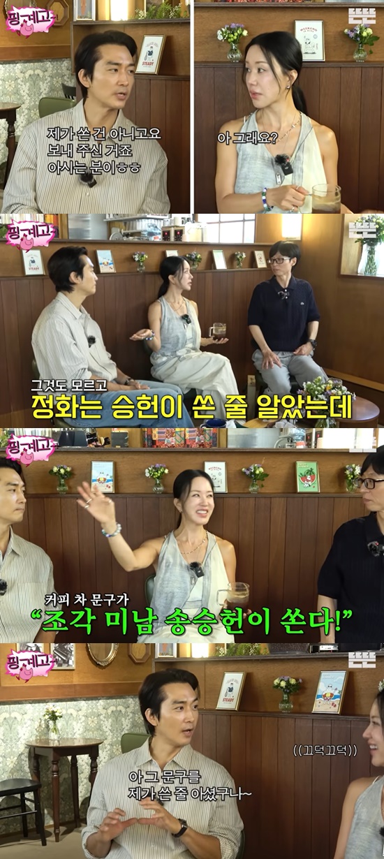 그러자 송승헌은 "아 그 문구를 제가 쓴 줄 아셨구나"라며 웃었고, 엄정화는 "'아, 그렇지. 사실이니까'"라며 납득하는 모습을 보였다.