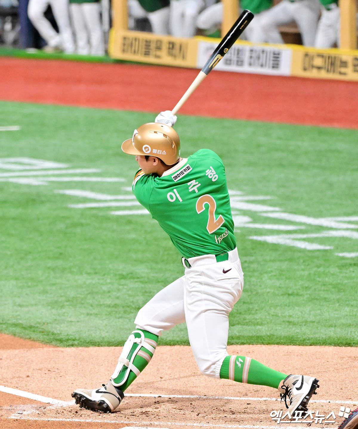 (엑스포츠뉴스 고척, 김한준 기자) 2일 오후 서울 구로구 고척스카이돔에서 열린 '2025 신한 SOL Bank KBO리그' 롯데 자이언츠와 키움 히어로즈의 경기, 1회말 2사 1,2루 키움 이주형이 2타점 2루타를 날리고 있다.