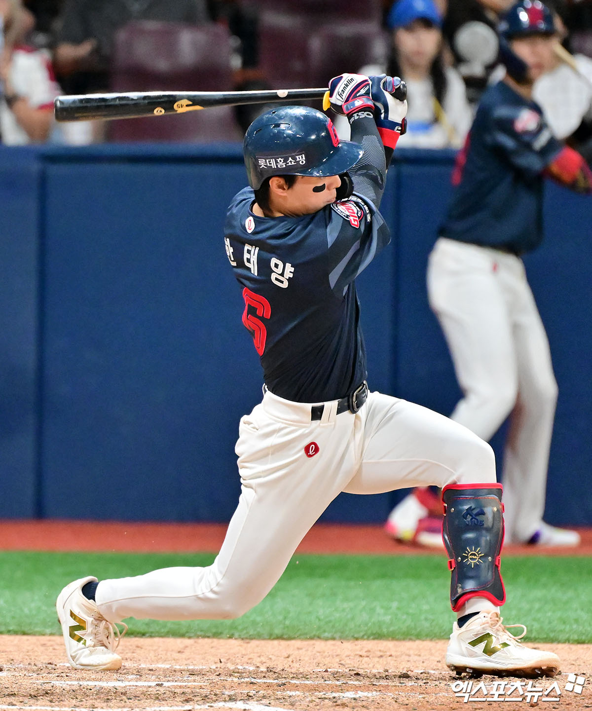 (엑스포츠뉴스 고척, 김한준 기자) 2일 오후 서울 구로구 고척스카이돔에서 열린 '2025 신한 SOL Bank KBO리그' 롯데 자이언츠와 키움 히어로즈의 경기, 6회초 롯데 한태양이 좌전안타를 날리고 있다.