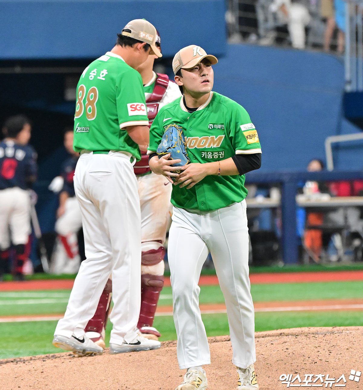 (엑스포츠뉴스 고척, 김한준 기자) 2일 오후 서울 구로구 고척스카이돔에서 열린 '2025 신한 SOL Bank KBO리그' 롯데 자이언츠와 키움 히어로즈의 경기, 6회초 무사 1,2루 키움 박윤성이 마운드를 내려오고 있다.