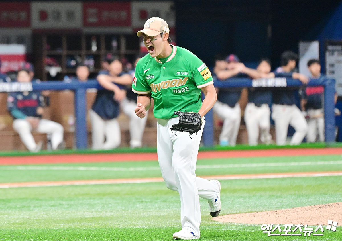 (엑스포츠뉴스 고척, 김한준 기자) 2일 오후 서울 구로구 고척스카이돔에서 열린 '2025 신한 SOL Bank KBO리그' 롯데 자이언츠와 키움 히어로즈의 경기,7회초 수비를 마친 키움 조영건이 포효하고 있다.