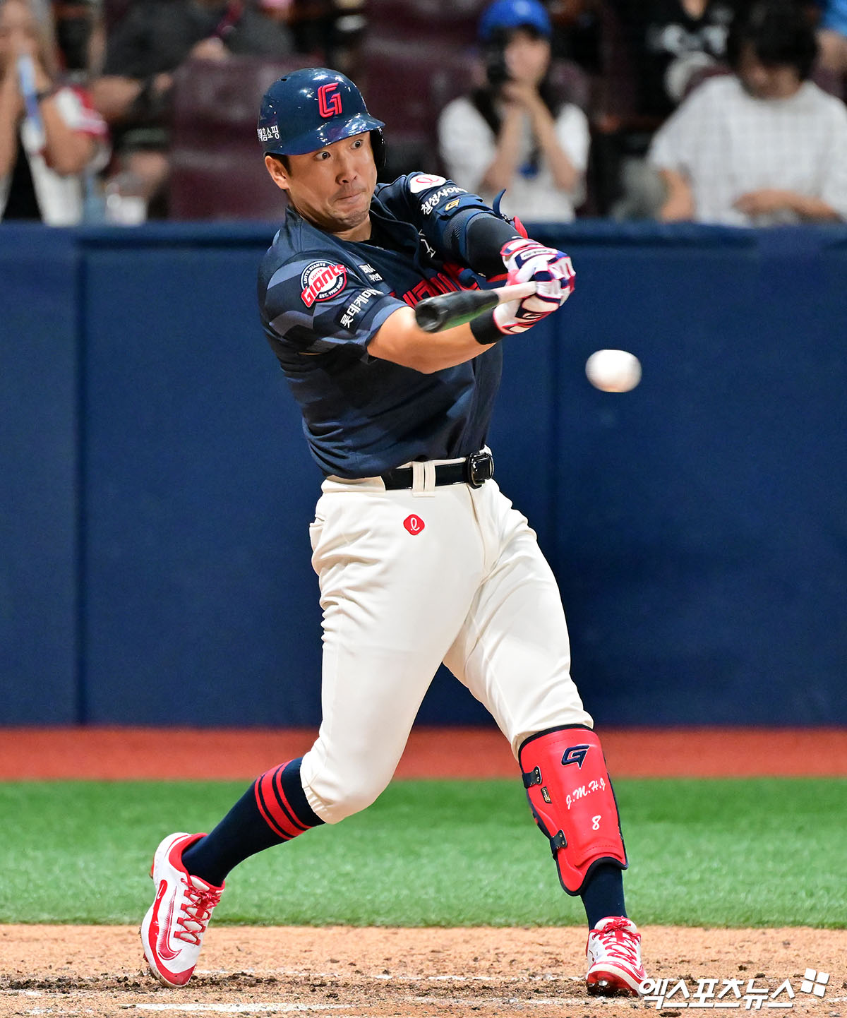 (엑스포츠뉴스 고척, 김한준 기자) 2일 오후 서울 구로구 고척스카이돔에서 열린 '2025 신한 SOL Bank KBO리그' 롯데 자이언츠와 키움 히어로즈의 경기, 9회초 2사 1,2루 롯데 전준우가 동점 적시타를 날리고 있다.