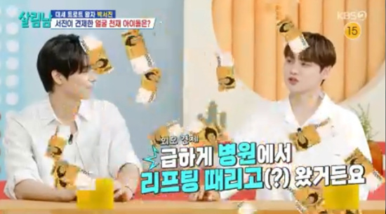 이날 박서진은 더보이즈 주연이 나오자 "어제 아이돌 게스트가 나오신다고 해서 급하게 병원에서 리프팅 때리고 왔다"고 털어놨다.