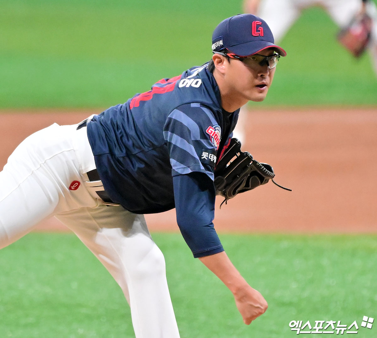 (엑스포츠뉴스 고척, 김한준 기자) 3일 오후 서울 구로구 고척스카이돔에서 열린 '2025 신한 SOL Bank KBO리그' 롯데 자이언츠와 키움 히어로즈의 경기, 1회말 롯데 선발투수 박세웅이 공을 힘차게 던지고 있다.