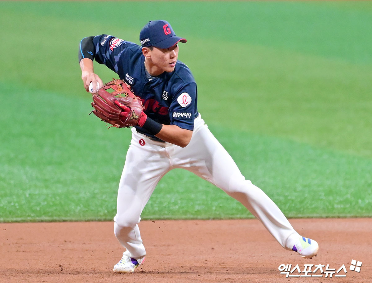 (엑스포츠뉴스 고척, 김한준 기자) 3일 오후 서울 구로구 고척스카이돔에서 열린 '2025 신한 SOL Bank KBO리그' 롯데 자이언츠와 키움 히어로즈의 경기, 1회말 2사 1루 롯데 박승욱이 키움 카디네스의 타구를 처리하고 있다.