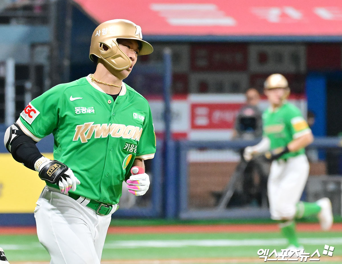 (엑스포츠뉴스 고척, 김한준 기자) 3일 오후 서울 구로구 고척스카이돔에서 열린 '2025 신한 SOL Bank KBO리그' 롯데 자이언츠와 키움 히어로즈의 경기, 5회말 2사 3루 키움 송성문이 1타점 적시타를 날리고 있다.