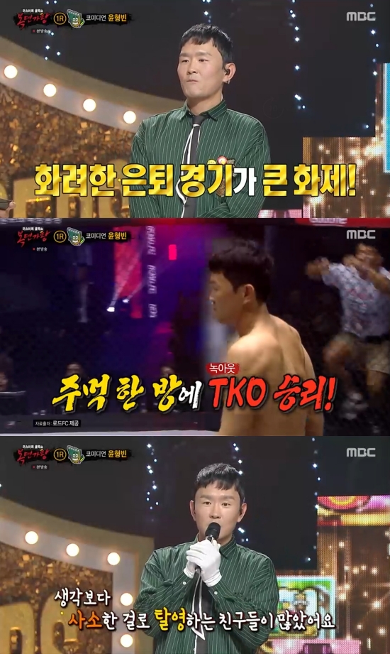 최근 TKO 승리로 장식한 은퇴 경기도 화제였다. 윤형빈은 "밴쯔씨가 격투기로 전향하면서 저를 콜아웃했다. 저는 자존심이 상했던 게 저는 경력이 있는데도 밴쯔가 이긴다고 하더라. 그래서 더 열심히 준비했다"고 밝혔다.