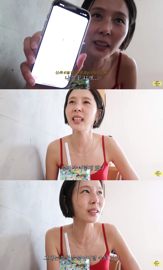 김나영은 "목표 불꽃 있냐"는 제작진의 질문에 "365일"이라며 "그때는 한국말 잊어버릴 수도 있다. 지금 나랑 이야기 많이 해 놔라"라고 말했다.