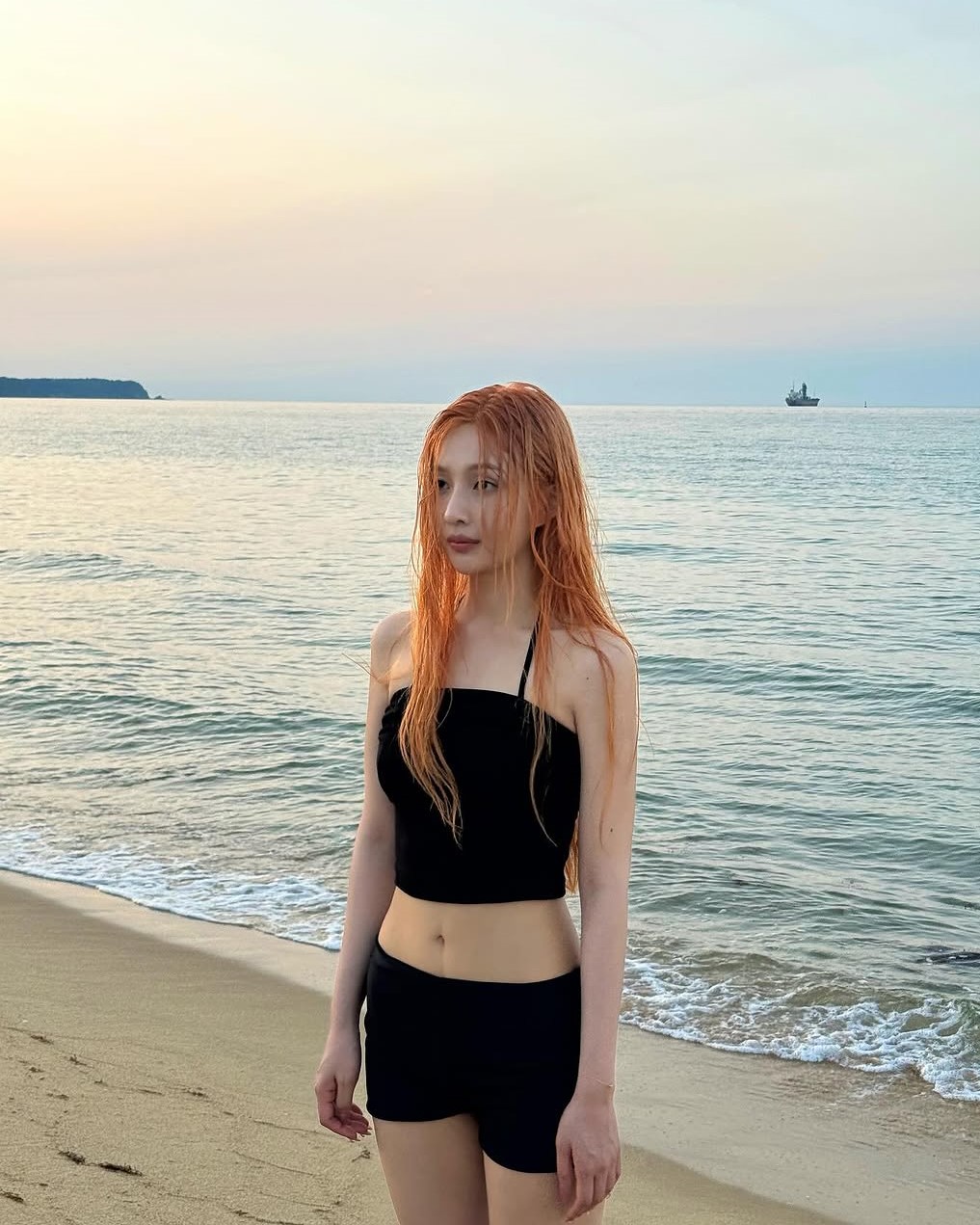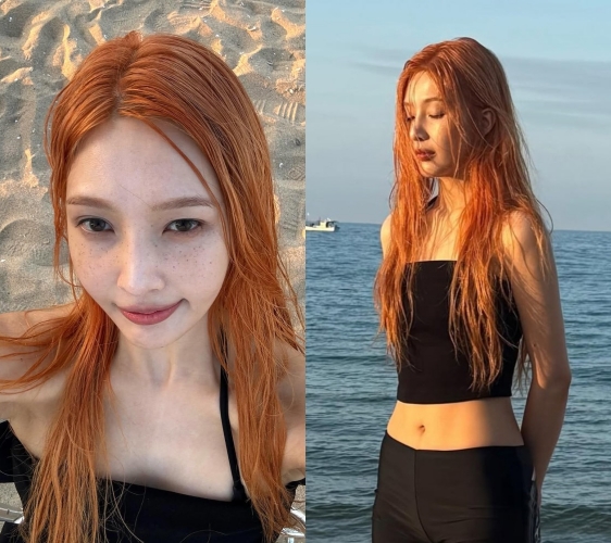 공개된 사진 속 조이는 젖은 오렌지색 머리카락을 늘어뜨린 채 해변에서 포즈를 취하고 있어 눈길을 끈다.