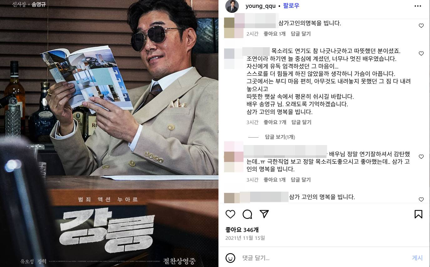 그의 SNS는 2021년 영화 '강릉' 홍보 게시글이다. 4년 전에 멈춘 게시글에 많은 네티즌들은 댓글을 통해 "삼가 고인의 명복을 빕니다", "그곳에서는 행복하길 바랍니다", "연기 너무 좋아했어요", "셰익스피어 인 러브 공연 끝나고 멀리서 배우님을 뵀었고, 사진 찍어달라고 하려고 했는데 지인분들하고 얘기중이셔서 못했었는데 그때가 처음이자 마지막일줄 알았더라면 얘기라도 해볼걸 그랬네요.. 카지노 보고 팬됐었는데 배우님 그곳에선 편히 쉬시길 바랍니다.." 등의 반응을 보이며 애도를 표했다.