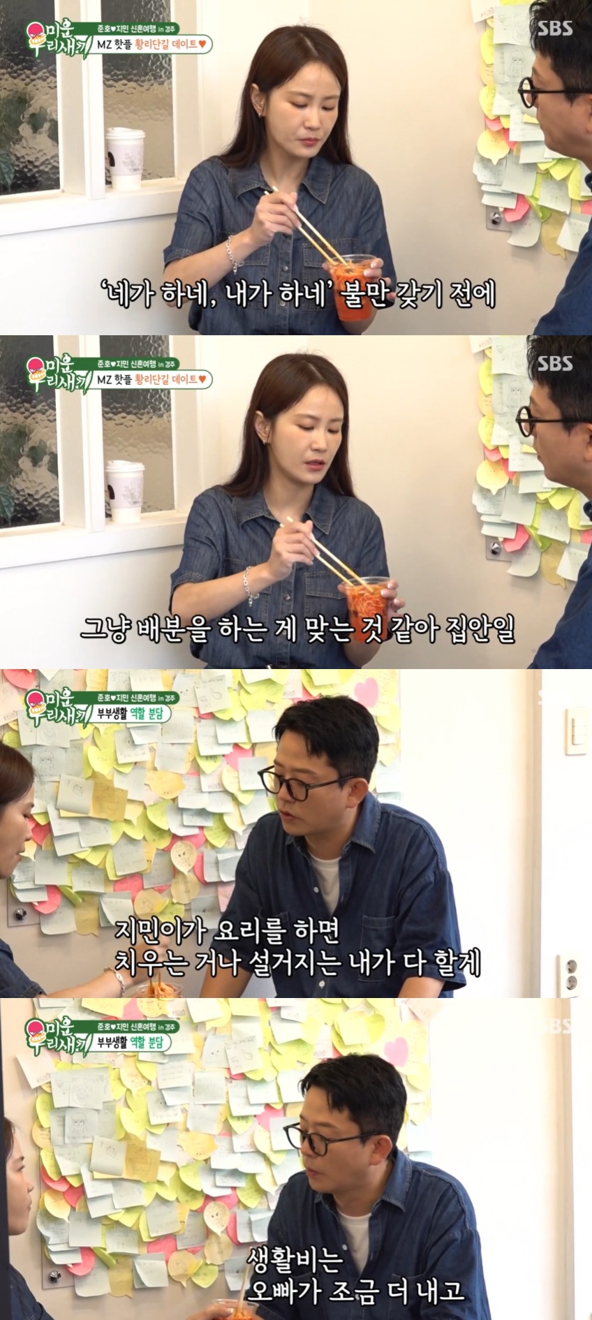 "내가 이래서 빨리빨리 집안일을 잘 하는 거다"라는 김지민은 "우리가 이제 합쳤으니 네가 하네 내가 하네 불만 갖기 전에 집안일을 배분하는 게 맞는 거 같다"고 이야기했다. 이에 김준호는 "지민이가 요리하면 치우고 설거지는 내가 다 하겠다. 치우고 재활용 쓰레기를 버리겠다"고 밝혀 눈길을 끈다.