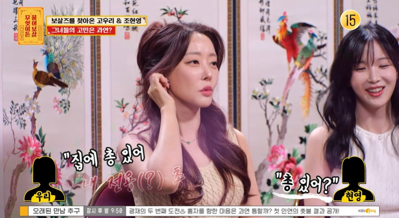 서장훈이 "그래서 고민이 뭐냐"고 하자 고우리는 "콘셉트가 아무래도 결혼도 했고 하다 보니 거침없는 19금 멘트들이 나오기 시작하면서 야한 말 빨리하는 아줌마가 됐다. 예를 들어 '총 있어?' 이러면 '집에 총 있다. 제 전용 총' 이러면서"라고 털어놨다.
