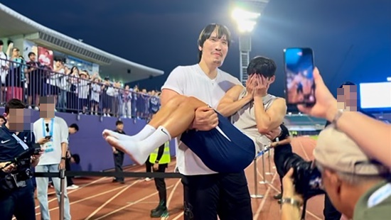 이후 최홍만은 토트넘의 유망주 양민혁을 번쩍 들어 올리는 퍼포먼스로 환호를 이끌었다.