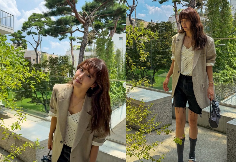 그는 린넨 소재의 오버핏 베이지 재킷과 도트 패턴 슬리브리스, 블랙 데님 반바지를 매치해 감각적인 여름 스타일링을 완성했다. 자연스러운 웨이브 헤어와 은은한 메이크업은 채정안 특유의 분위기를 더욱 돋보이게 했다.