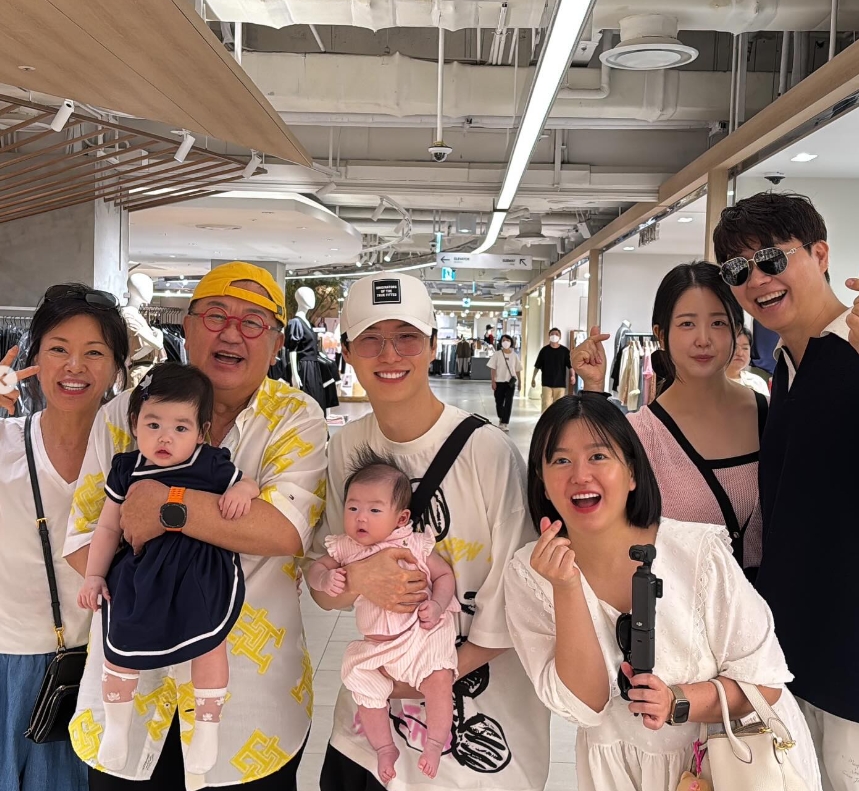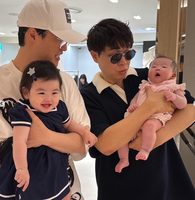 공개된 사진에는 박수홍 부부의 딸을 안고 있는 원혁과 그 옆에 이수민 부부의 딸을 안고 있는 박수홍의 모습이 담겨 있다.