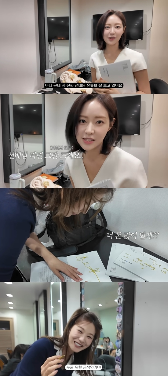신슬기는 "저 진짜 선배님 유튜브 잘 보고 있다. 선배님. 라면 그만 드세요"라고 말해 애청자임을 인증하기도 했다. 또 유인영에게 싸인을 요청한 신슬기는 "돈 많이 들어오게 제가 금색으로 준비했다"라고 밝혔다.