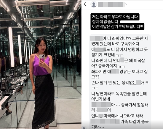 공개된 사진에는 이지혜가 받은 메신저 내용이 담겨있다. 익명의 작성자는 "XXX야 니 좌파였나? 그동안 재밌게 봤는데 바로 구독 취소다"라며 강한 분노를 드러냈다. 또 "좌파인데 왜 언니는 미국에 사냐. 중국을 가야지"라며 미국에 사는 이지혜의 친언니를 소환했다.
