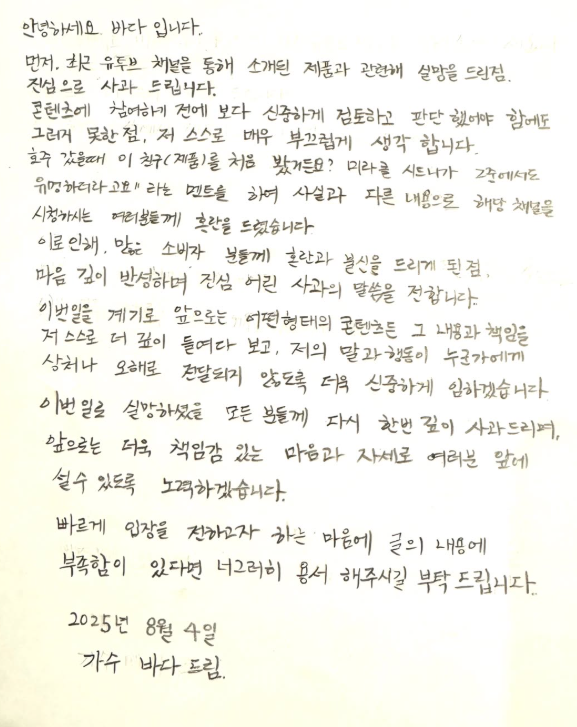 이에 바다는 지난 5일 입장문을 통해 "실망을 드린 점 진심으로 사과드린다"며 "콘텐츠에 참여하기 전에 보다 신중하게 검토하고 판단했어야 함에도 그러지 못한 점, 저 스스로 매우 부끄럽게 생각한다"고 사과했다.