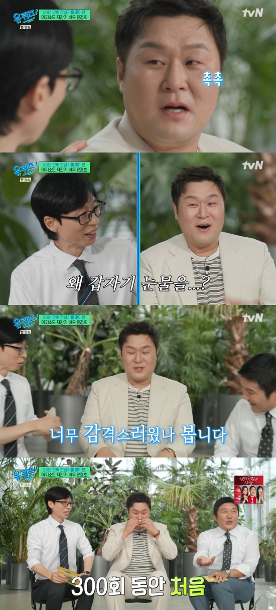 특히 윤경호는 유재석을 보자마자 갑작스럽게 눈물을 흘렸고, "왜 눈물이 나는지 모르겠다. 반갑게 인사를 하고 싶었는데 너무 감격스러웠나 보다"라며 털어놨다.