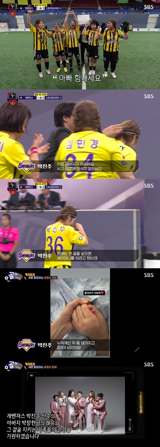 박진주는 "아버지가 아프시다. 사고 때문에 의식이 없다. 제가 첫 골을 넣으면 하려고 했는데 선배님들이 '우리는 하나다, 한 골 터지면 무조건 세리머니를 하라'고 하셨다"고 설명했다.. 오나미도 "골을 넣는 순간 진주 아버지께 세리머니를 하자. 기뻐서 빨리 회복하셨으면 좋겠다"고 바람을 전했다.
