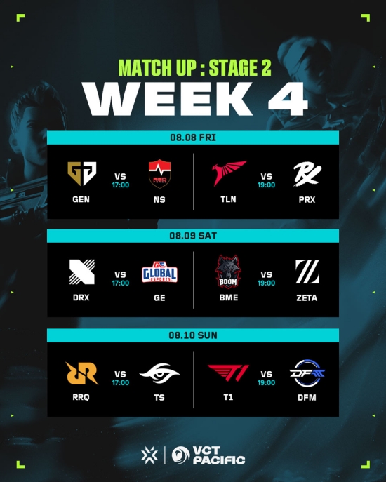 5대5 대전형 캐릭터 기반 전술 슈팅 게임 '발로란트'의 개발 및 유통사인 라이엇 게임즈(한국 대표 조혁진)는 8월 8일(금)부터 11일(일)까지 서울특별시 마포구 상암동에 위치한 SOOP 콜로세움에서 열리는 VCT 퍼시픽 스테이지 2 4주 차에서 알파조에 속한 농심 레드포스가 한 장 남은 티켓을 쟁취하기 위해 젠지와 대결을 펼친다고 밝혔다.