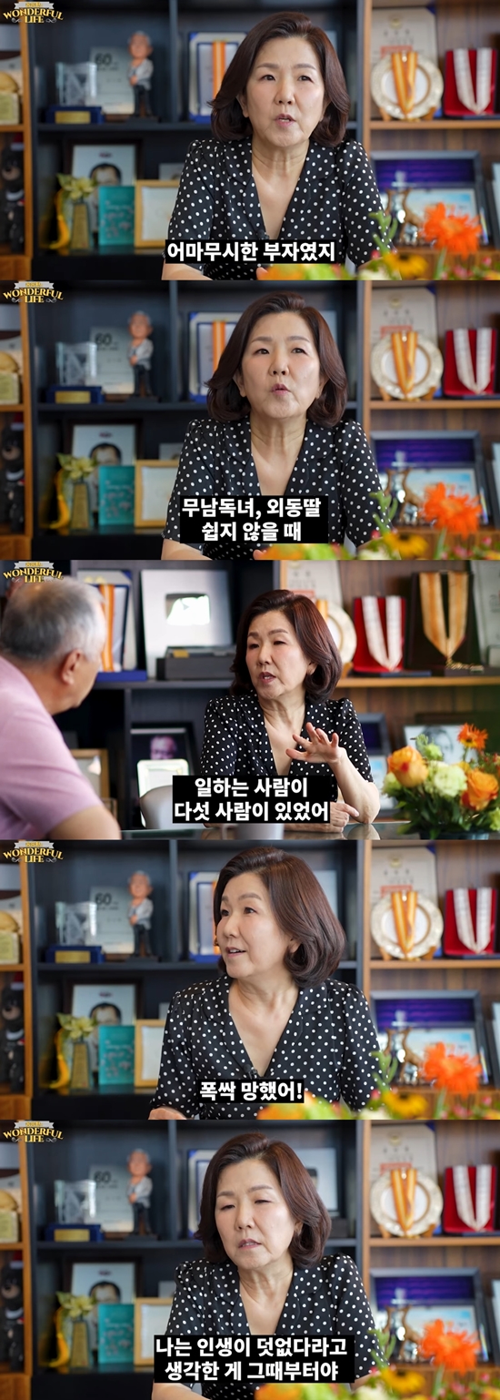 이어 그는 "초등학교 6학년 때 새엄마가 돌아가셨는데, 아버지가 사업에 먼저 실패하셨다. (아버지 사업이) 폭삭 망했다. 그러면서 이제 남의 집 문간방에 들어가고 학교도 못 다니고 내 인생이 꼬꾸라진 거다. '인생이 덧없다'라고 생각한 게 그 때부터다"라며 힘든 시절을 회상했다.