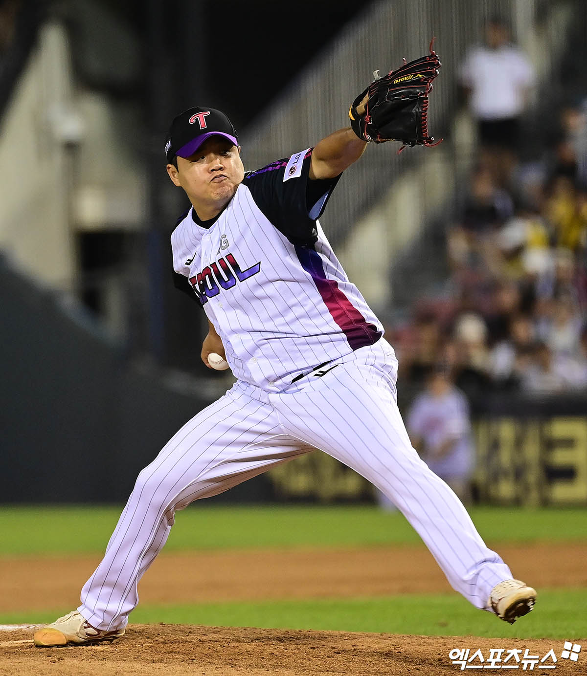 (엑스포츠뉴스 잠실, 박지영 기자) 8일 오후 서울 송파구 잠실야구장에서 열린 '2025 신한 SOL Bank KBO리그' 한화 이글스와 LG 트윈스의 경기, 8회초 LG 장현식이 역투하고 있다.
