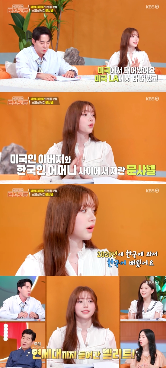 이날 방송에서 문샤넬은 "미국 LA에서 태어났다. 아버지는 미국인, 어머니는 한국인으로 혼혈이다. 2020년에 한국에 와서 5년 전부터 한국어를 배워서 아직 서투르다"라고 인사했다.