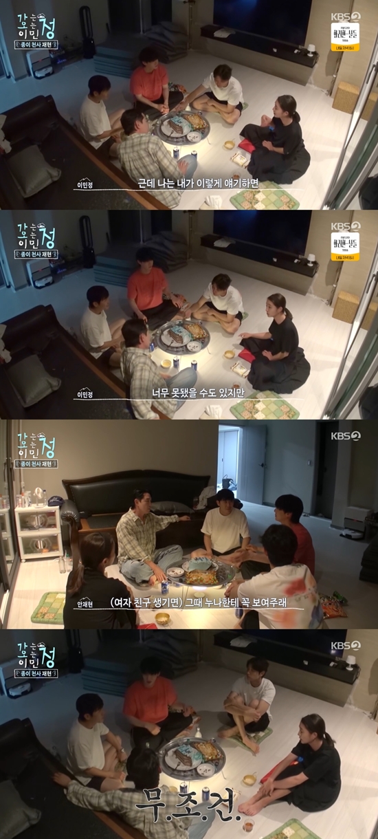 분위기가 무르익자, 이민정은 "내가 이렇게 얘기하면 못됐을 수도 있지만 그래도 솔로일 때 하루하루를 (즐겼으면 좋겠다)"라며 안재현에게 조언을 건넸다. 또 이민정은 "사귀라는 게 아니다. 너무 시간이 아까울 것 같다"라고 말했다.