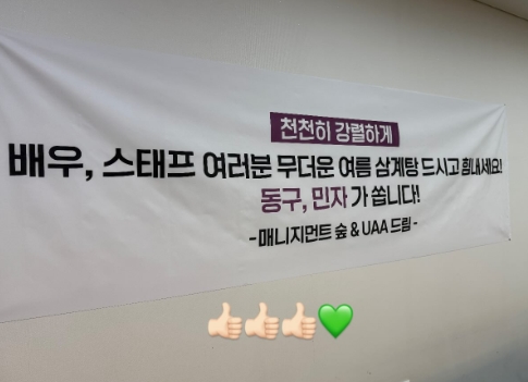 두 소속사에서 보낸 현수막에는 "배우, 스태프 여러분 무더운 여름 삼계탕 드시고 힘내세요! 동구, 민자가 쏩니다!"라는 글이 적혀 있다.