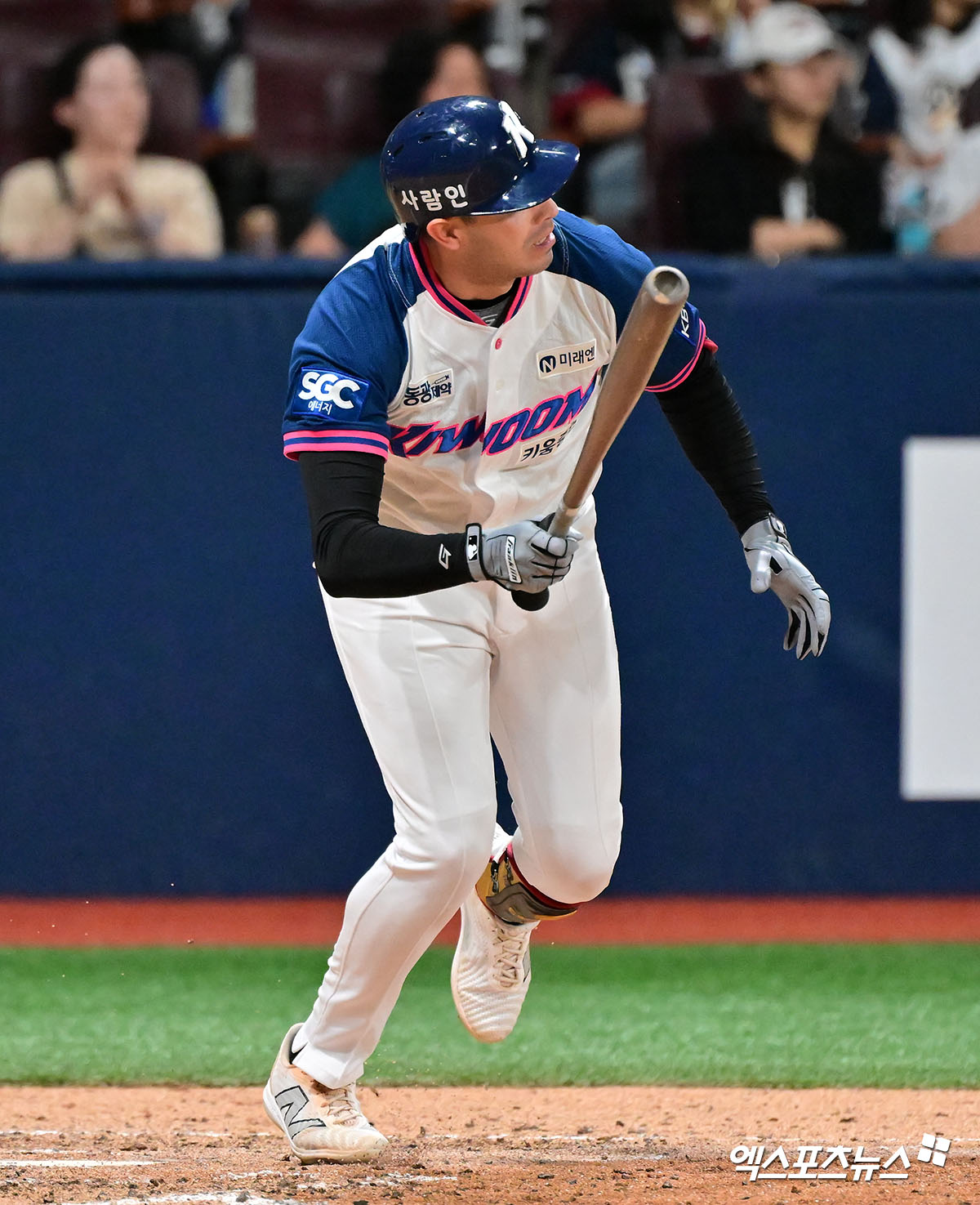 (엑스포츠뉴스 고척, 김한준 기자) 9일 오후 서울 구로구 고척스카이돔에서 열린 '2025 신한 SOL Bank KBO리그' 두산 베어스와 키움 히어로즈의 경기, 5회말 1사 2,3루 키움 카디네스가 3루 주자를 불러들이는 타격을 하고 있다.
