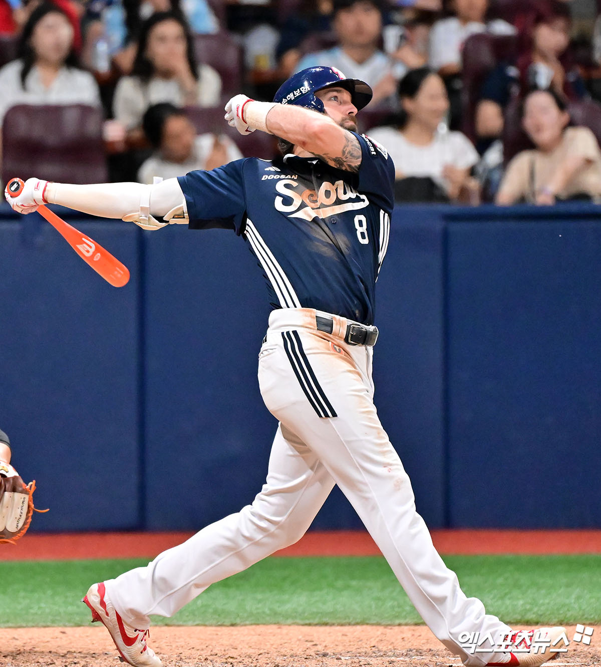 (엑스포츠뉴스 고척, 김한준 기자) 9일 오후 서울 구로구 고척스카이돔에서 열린 '2025 신한 SOL Bank KBO리그' 두산 베어스와 키움 히어로즈의 경기, 9회초 1사 두산 케이브가 3루타를 날리고 있다..