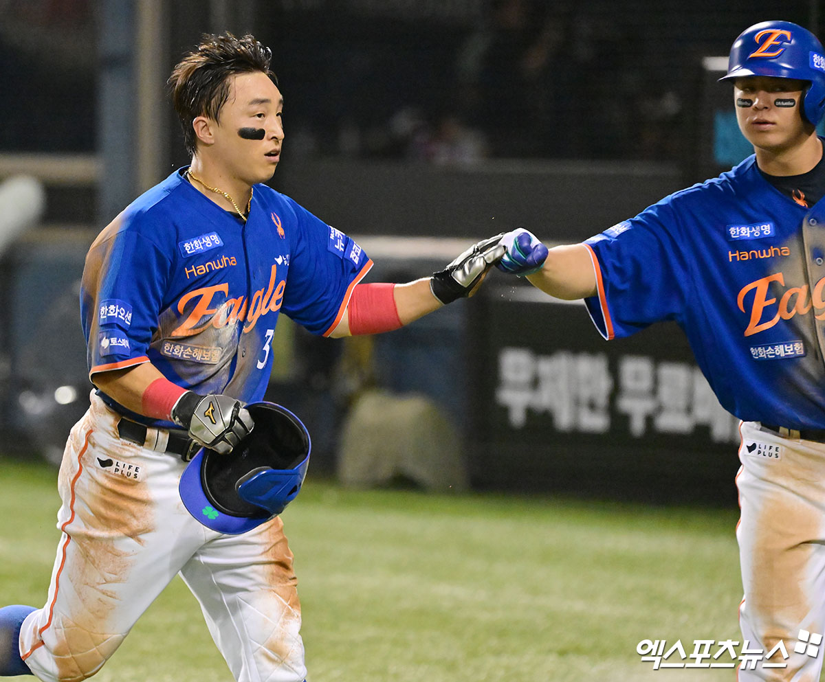 (엑스포츠뉴스 잠실, 김한준 기자) 10일 오후 서울 송파구 잠실야구장에서 열리는 '2025 신한 SOL Bank KBO리그' 한화 이글스와 LG 트윈스의 경기, 7회초 1사 3루 한화 손아섭이 문현빈의 내야땅볼때 득점에 성공하고 있다.